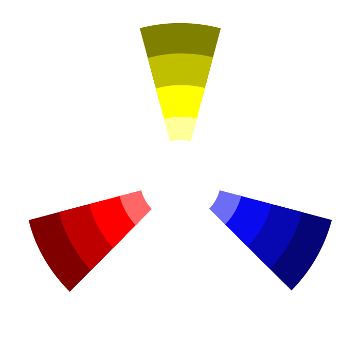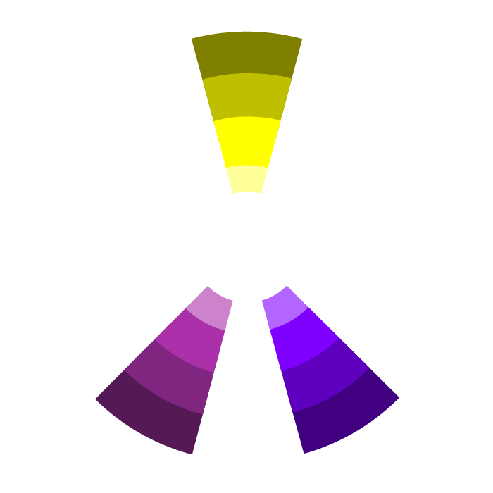 A triadic scheme is a combination of three colors that are equally spaced on the color wheel, forming a triangle. Triadic palettes are rich in color and allow visual artists to create contrasting, yet harmonious, designs. The main trick is to balance composition with the help of color hierarchy – let one shade dominate and use the other two as accents.