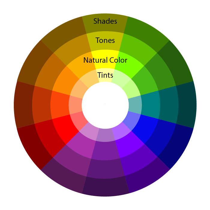 Color wheels come in many different styles. In addition to the natural colors, other colors include tints (colors with white added to lighten them), tones (colors with grey added to dull them), and shades (colors with black added to darken them).